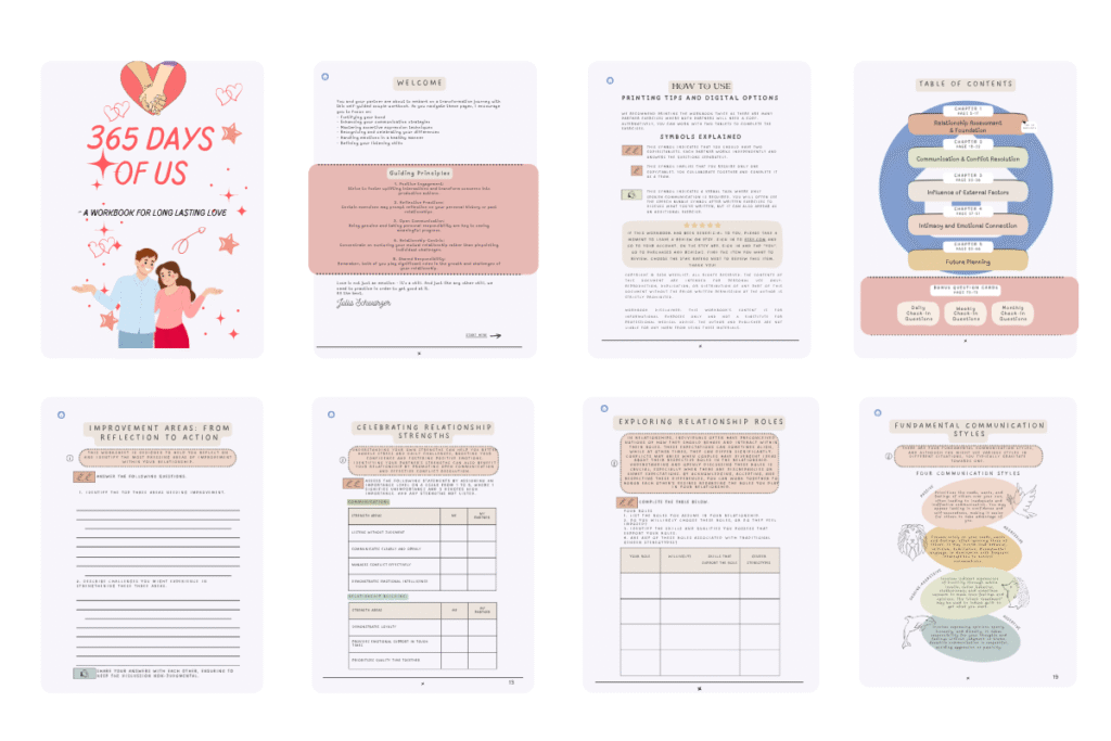 “Couple’s Connection Workbook” is a daily relationship workbook designed for couples. It includes 365 unique prompts—one for each day of the year—to help partners grow closer, communicate better, and build emotional intimacy.
